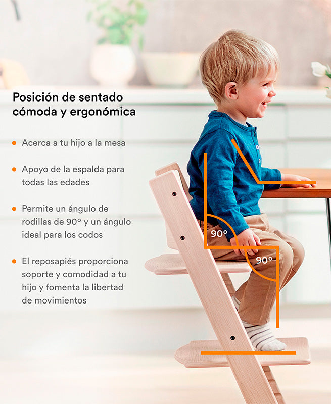TRIPP TRAPP -® es una ingeniosa silla que revolucionó la categoría infantil de sillas en 1972, cuando fue lanzada por primera vez. Está diseñada para arrimarse a la mesa del comedor y acercar a tu bebé al corazón de la familia, permitiéndole así aprender y desarrollarse a tu lado. Su diseño inteligente proporciona libertad de movimiento gracias a la posibilidad de regular la profundidad y la altura del asiento y del reposapiés. Cuando esté bien regulada, tu hijo estará sentado en una posición ergonómicamente correcta y cómoda para cualquier edad.