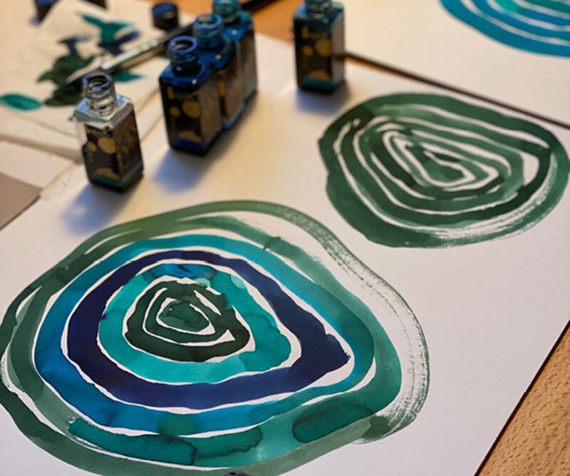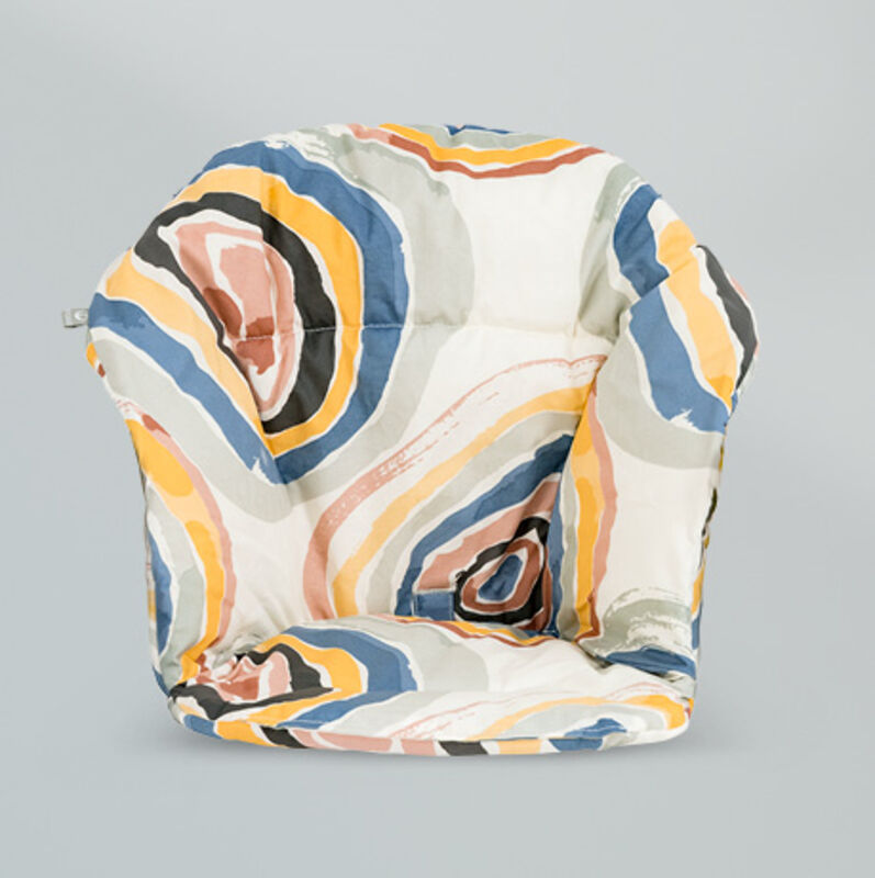 Para el cojín Círculos Stokke® Clikk™, optó por una traducción menos literal e ilustró el crecimiento dando lugar a una representación impresionista de los anillos de los árboles.